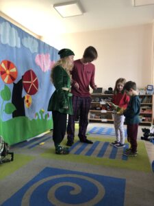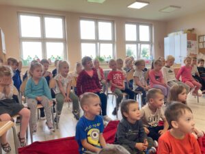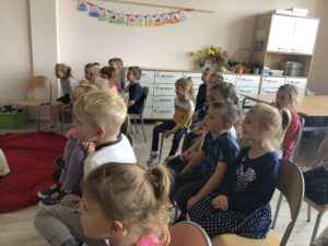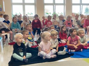 Dnia 28.09.2021r. Nasze przedszkole odwiedził Teatr NIEBIESKI BALONIK ze spektaklem pt. ,,Przygody Ptysia z Cukrowej Krainy”. Przedszkolaki aktywnie uczestniczyły w przedstawieniu: śpiewały, odpowiadały na liczne pytania, a nawet podawały aktorom różne rekwizyty. Dzieci poznały zasady zdrowego odżywiania się i dowiedziały się o konieczności jedzenia warzyw i owoców, aby móc cieszyć się zdrowiem!
