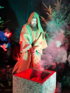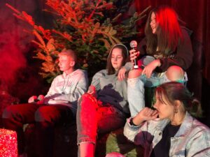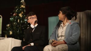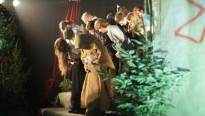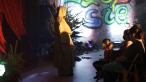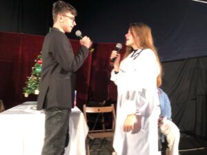 Uczniowie klas 7b, 7c, 8a, 8b i 8c pod opieką ks. Pawła Hubczaka, pani Barbary Kolber i pani Agaty Ćwiertni przedstawili współczesną wersję jasełek. Efekt kilkumiesięcznej pracy zaprezentowano trzykrotnie: rano dla uczniów klas 4-8, następnie dla uczniów klas 1-3 oraz wieczorem dla rodziców i wszystkich chętnych. Widzowie mieli niezapomnianą okazję zobaczyć historię młodych ludzi, nieco zagubionych we współczesnym świecie, z dużym bagażem doświadczeń, którzy na swój sposób przeżywają Boże Narodzenie. Jedni z nich, pod wpływem niecodziennych zdarzeń, zmieniają swoje życie, inni… No cóż,nie wszyscy korzystają z otrzymanej szansy. Zniewalająca scenografia, perfekcyjna gra aktorska naszej młodzieży to atuty tego przedstawienia. Na szczególną uwagę zasługuje efektowna dekoracja przygotowana przez księdza Pawła, jego przyjaciół, rodziców uczniów. Na trzech scenach widzieliśmy żywe świerki, ławki parkowe, olbrzymie graffiti. Niezwykła gra świateł, doskonałe nagłośnienie to kolejne zalety tych jasełek. Dodatkową atrakcją naszego przedstawienia był występ zespołu muzycznego prowadzonego przez panią Marię Mikułę. Uzdolnieni młodzi soliści umilili widzom czas. Było również wspólne kolędowanie.