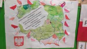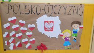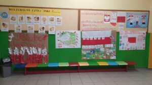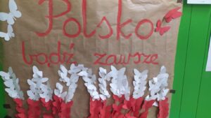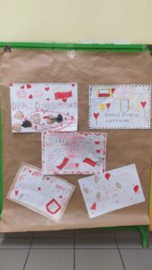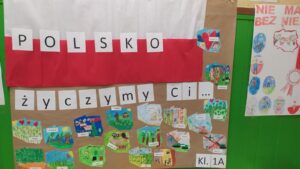 W ramach II modułu „Tu jest moje miejsce” innowacji pedagogicznej „Z kulturą mi do twarzy” 8 listopada w naszej szkole odbyła się Uroczysta Akademia z okazji Narodowego Święta Niepodległości na pamiątkę 104 rocznicy odzyskania przez Polskę niepodległości na którą klasy 1-3 przygotowały kartki z życzeniami dla Polski. W tej scenerii wszyscy uczestnicy odśpiewali hymn państwowy.