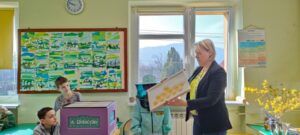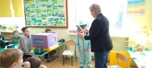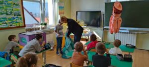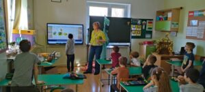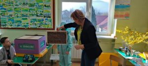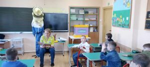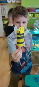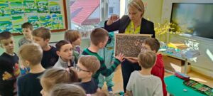 . Tym razem przeczytali opowiadanie o dzielnej pszczółce, która trafiła do przedszkola i mocno przestraszyła najmłodszych. Opowiadanie to stało się przyczyną do rozmowy na temat tego, jak ważne są pszczoły dla świata i człowieka. Dzieci nauczyły się, jak pomagać pszczołom, co sadzić. Dzięki pomocy rodziców, wypożyczono nam ul edukacyjny, stroje pszczelarzy i różne rekwizyty pszczelarza. Drugoklasiści stworzyli domki dla pszczół, posadzili miododajne rośliny i degustowali miody.