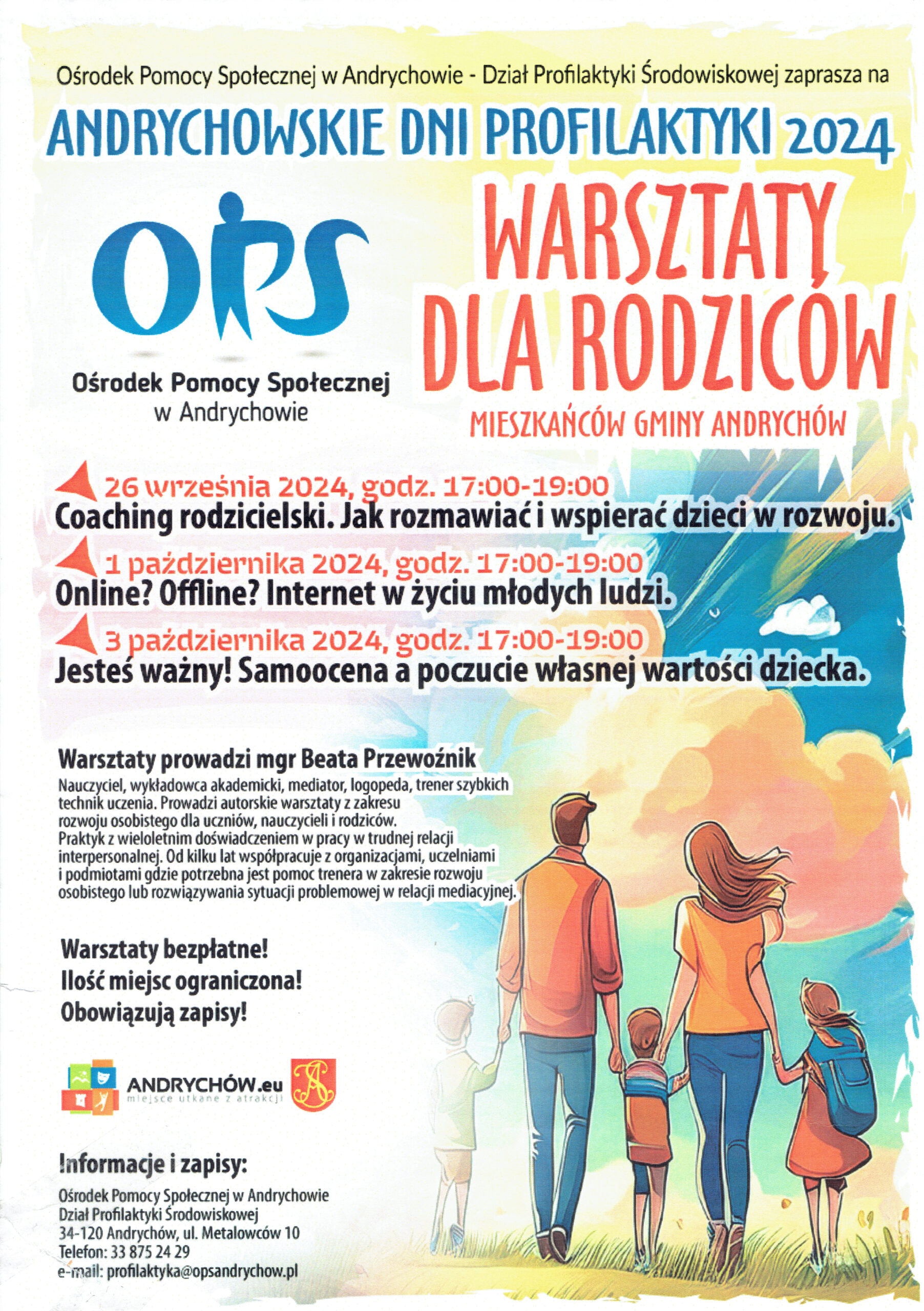 OPS w Andrychowie zaprasza zainteresowanych rodziców na bezpłatne, dwugodzinne (godz. 17.00 – 19.00) warsztaty prowadzone przez mgr Barbarę Przewoźnik w poniższych terminach i tematyce:26 września – Coaching rodzicielski. Jak rozmawiać i wspierać dzieci w rozwoju.1 października – Online? Offline? Internet w życiu młodych ludzi.3 października – Jesteś ważny! Samoocena a poczucie własnej wartości dziecka.Ilość miejsc ograniczona, obowiązują zapisy.Więcej szczegółów na plakacie.