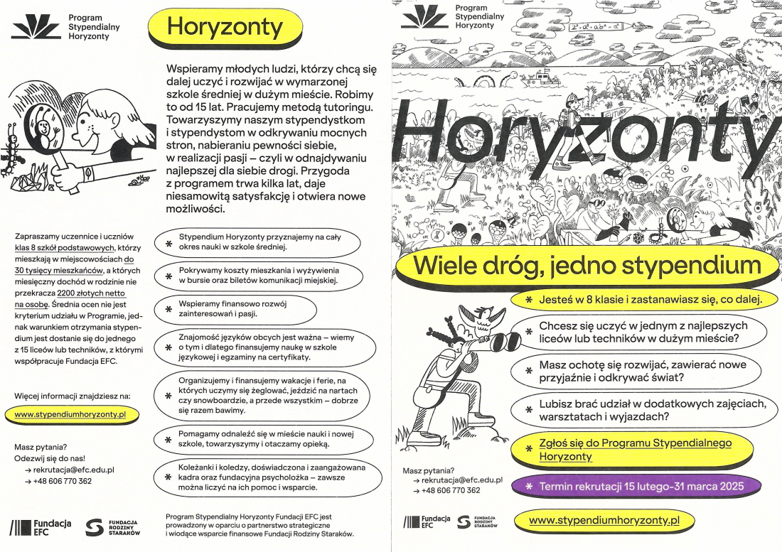 Zapraszamy uczennice i uczniów klas 8 szkół podstawowych, którzy mieszkają w miejscowościach do 30 tysięcy mieszkańców, a których miesięczny dochód w rodzinie nie przekracza 2200 złotych netto na osobę. Średnia ocen nie jest kryterium udziału w Programie, jednak warunkiem otrzymania stypendium jest dostanie się do jednego z 15 liceów lub techników, z którymi współpracuje Fundacja EFC. Program Stypendialny Horyzonty (1)