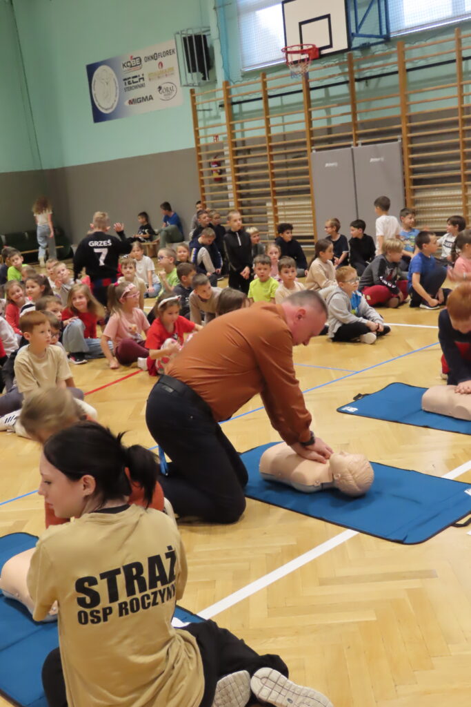 Do akcji przyłączyli się również wyjątkowi goście – strażacy OSP w Roczynach, którzy nie tylko wspierali uczestników podczas ćwiczeń, ale także przypomnieli zasady udzielania pierwszej pomocy. Ich obecność jak co roku była ogromnym wsparciem podczas tej inicjatywy.