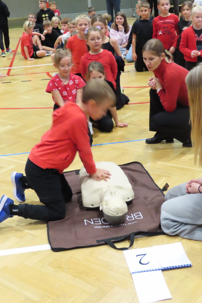 O godzinie 12:00 uczniowie klas 1-8 pod opieką nauczycieli przez 30 minut prowadzili RKO na 9 fantomach, ucząc się jednocześnie, jak prawidłowo reagować