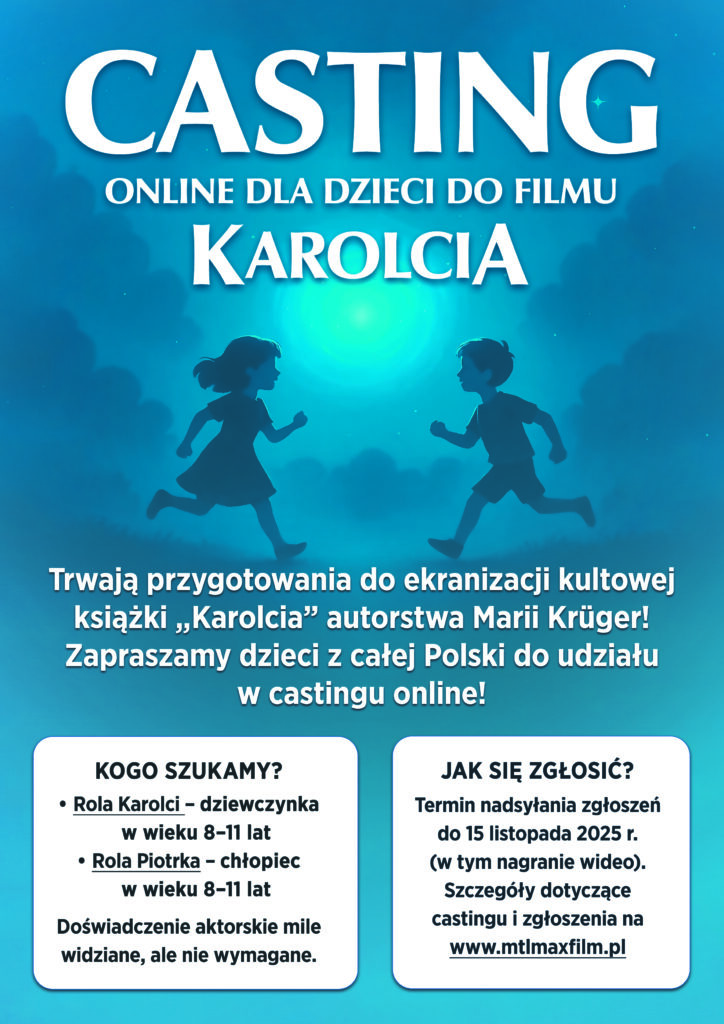 producent filmu fabularnego dla dzieci „Karolcia” (na podstawie książki Marii Krüger) firma MTL Maxfilm (www.mtlmaxfilm.pl) przeprowadza casting online dla odtwórców głównych ról: Karolci (8-11 lat) i Piotrka (8-11 lat). Zostaliśmy poproszeni o dystrybucję tę informacji wśród uczniów naszej szkoły. Szczegóły na temat castingu znajdą Państwo na stronie producenta: https://mtlmaxfilm.pl/index.php/pl/casting#karolcia