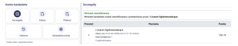 Po zalogowaniu się na konto w systemie rekrutacji, kandydat ma możliwość sprawdzenia statusu wniosku oraz w późniejszym etapie statusu osiągnięć. Po ogłoszeniu list zakwalifikowanych i niezakwalifikowanych, wynik rekrutacji również można sprawdzić poprzez zalogowanie się na konto kandydata.