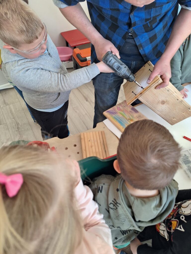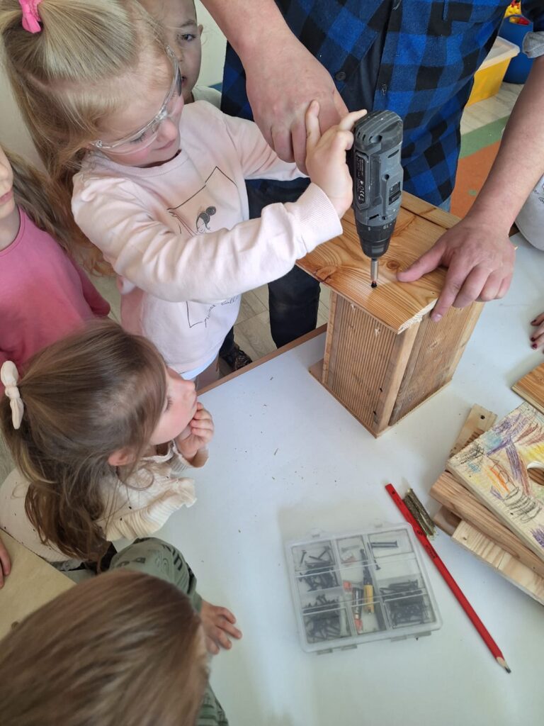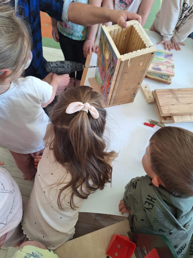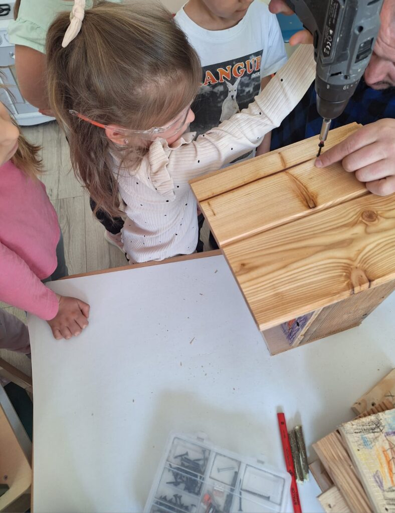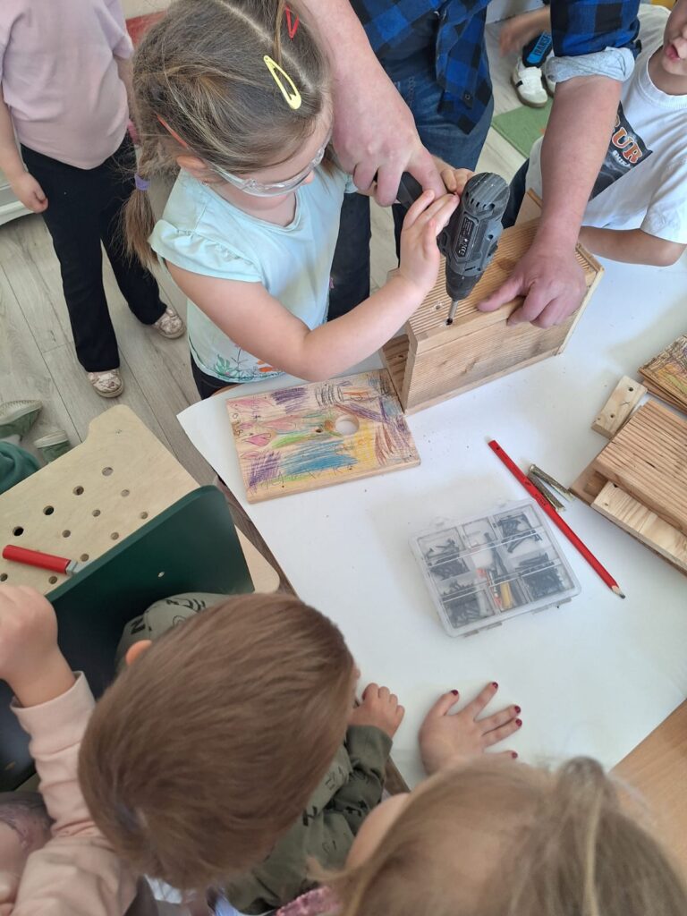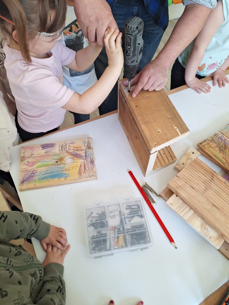 W piątkowe przedpołudnie grupę Słoneczek odwiedził tata Maksia Wani – Pan Grzegorz, który zaproponował przedszkolakom wspólne zbudowanie budek lęgowych dla ptaków. Dzieci z ogromnym zainteresowaniem obserwowały każdy etap pracy, ale także brały czynny udział w projektowaniu budek, co było dla nich niezwykłym doświadczeniem. W asyście Pana Grzegorza, Słoneczka miały okazję zamienić się w małych konstruktorów. Chętne dzieci po kolei wkręcały śrubki do desek ozdobionych przez nasze dziewczynki. Dzięki temu powstały piekne i solidne schronienia dla skrzydlatych przyjaciół. Na koniec wspólnie wybraliśmy się do naszego przedszkolnego ogródka, aby przymocować budki. Warsztaty te sprawiły przedszkolakom ogromną radość, a najbardziej to, że od teraz mogą obserwować przez okna naszej sali małych sąsiadów. Jeszcze raz serdecznie dziękujemy Panu Grzegorzowi za poświęcony czas, zaangażowanie i kolejne już spotkanie, gdyż niedawno mieliśmy również okazję podziwiać niezwykłego zielonego gościa – kameleona.