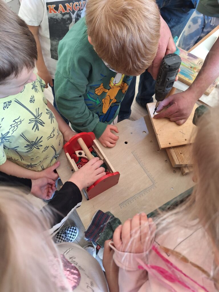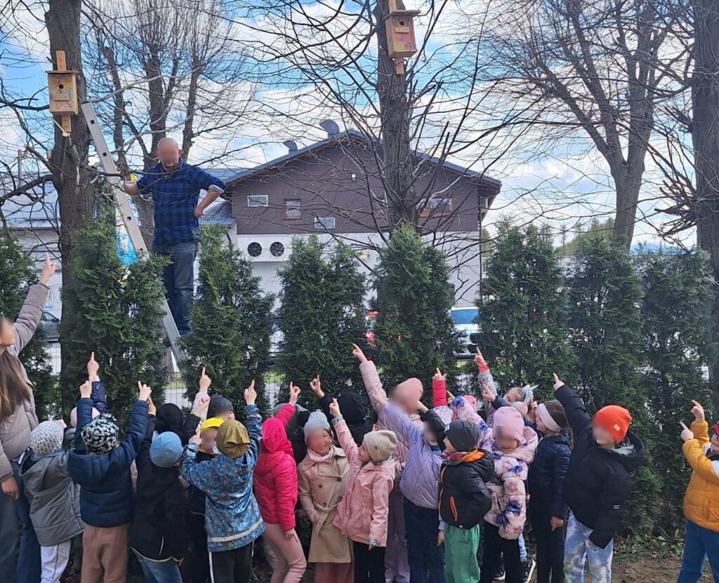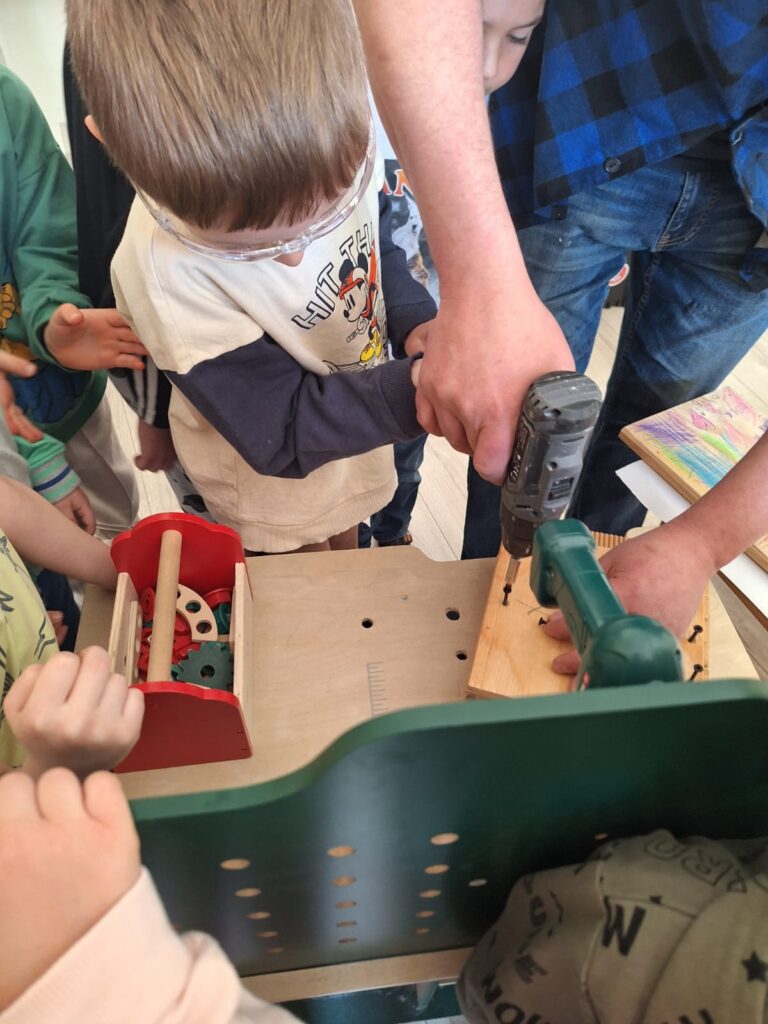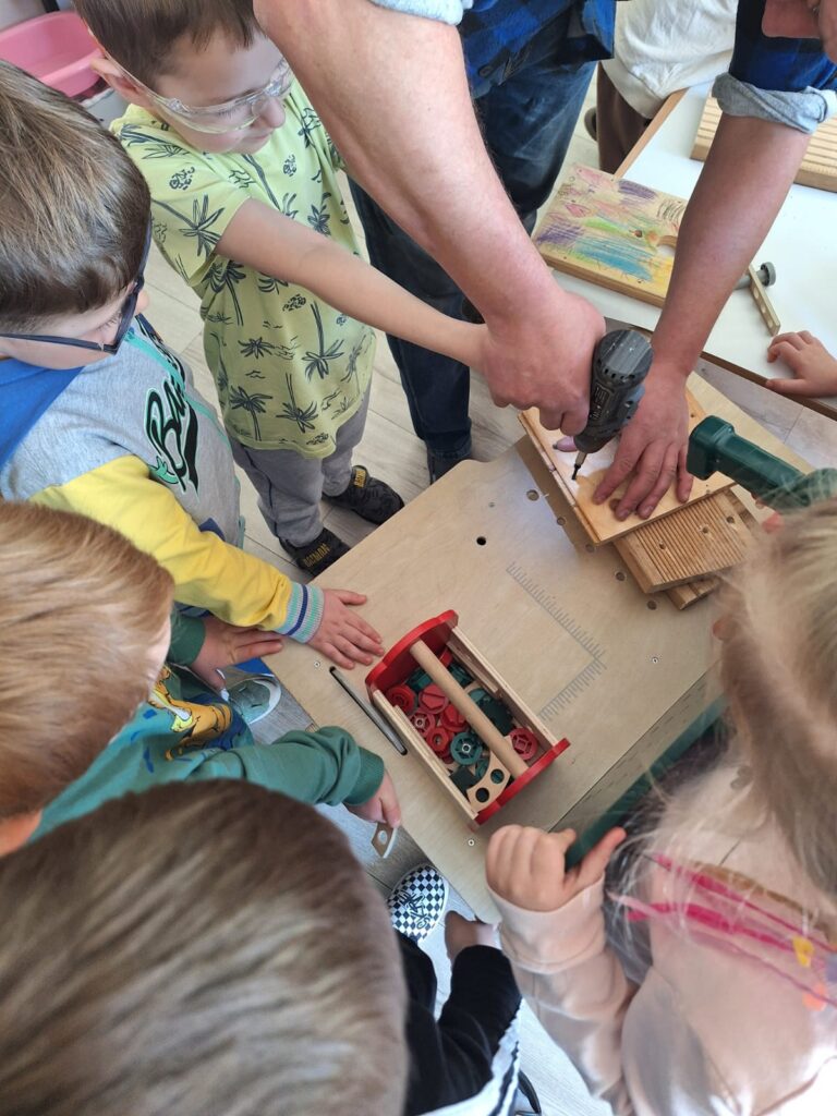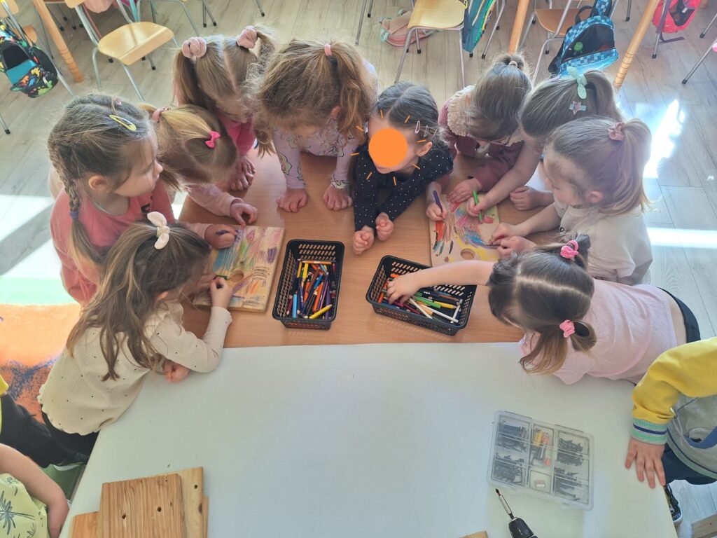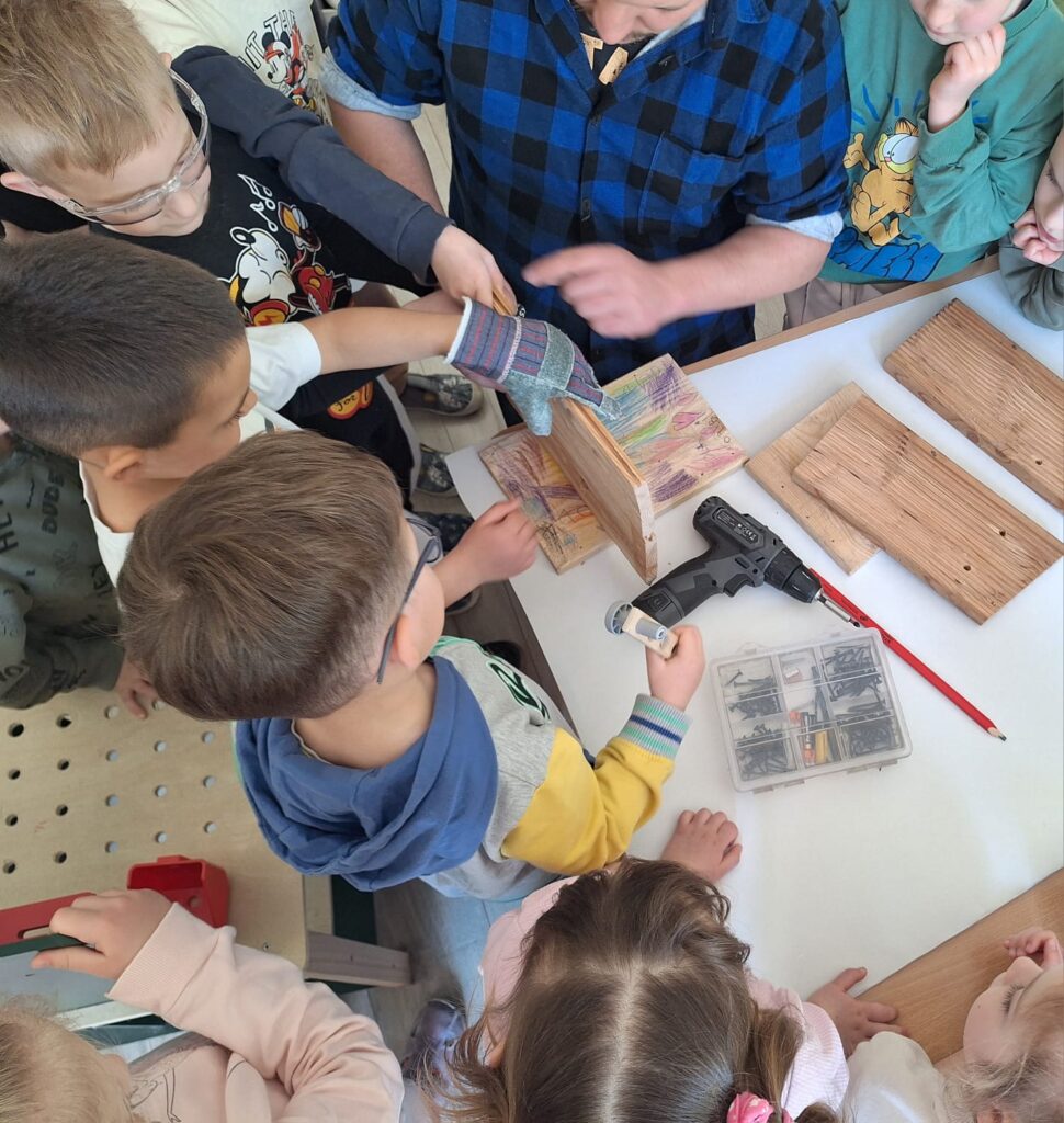 W piątkowe przedpołudnie grupę Słoneczek odwiedził tata Maksia Wani – Pan Grzegorz, który zaproponował przedszkolakom wspólne zbudowanie budek lęgowych dla ptaków. Dzieci z ogromnym zainteresowaniem obserwowały każdy etap pracy, ale także brały czynny udział w projektowaniu budek, co było dla nich niezwykłym doświadczeniem. W asyście Pana Grzegorza, Słoneczka miały okazję zamienić się w małych konstruktorów. Chętne dzieci po kolei wkręcały śrubki do desek ozdobionych przez nasze dziewczynki. Dzięki temu powstały piekne i solidne schronienia dla skrzydlatych przyjaciół. Na koniec wspólnie wybraliśmy się do naszego przedszkolnego ogródka, aby przymocować budki. Warsztaty te sprawiły przedszkolakom ogromną radość, a najbardziej to, że od teraz mogą obserwować przez okna naszej sali małych sąsiadów. Jeszcze raz serdecznie dziękujemy Panu Grzegorzowi za poświęcony czas, zaangażowanie i kolejne już spotkanie, gdyż niedawno mieliśmy również okazję podziwiać niezwykłego zielonego gościa – kameleona.