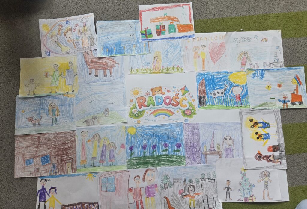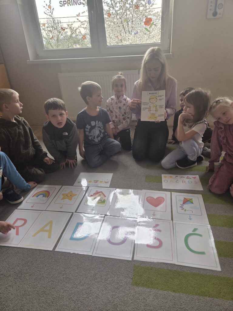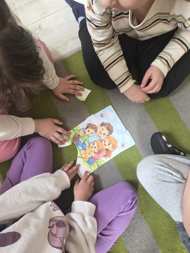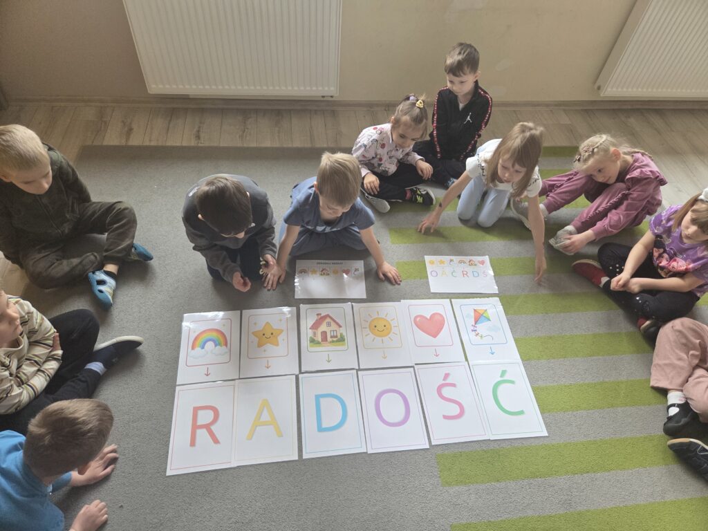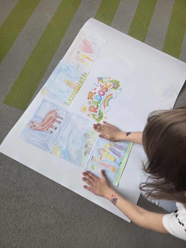 Kolejnym etapem było układanie puzzli obrazkowych i opowiadanie, co przedstawiają ilustracje. Ćwiczenie to rozwija spostrzegawczość oraz umiejętność wypowiadania się. W dalszej części zajęć przeprowadzono burzę mózgów – dzieci zastanawiały się, z czym kojarzy im się radość. Następnie rysowały swoją „własną radość” oraz sytuacje, które sprawiają im przyjemność, a z wykonanych prac powstał wspólny plakat.