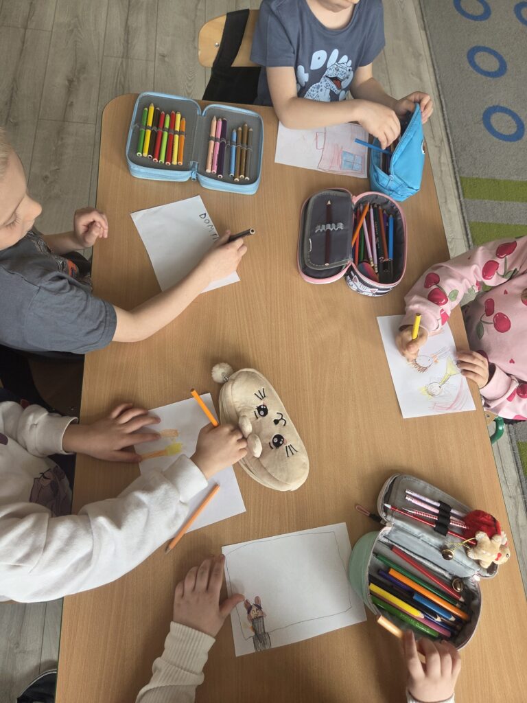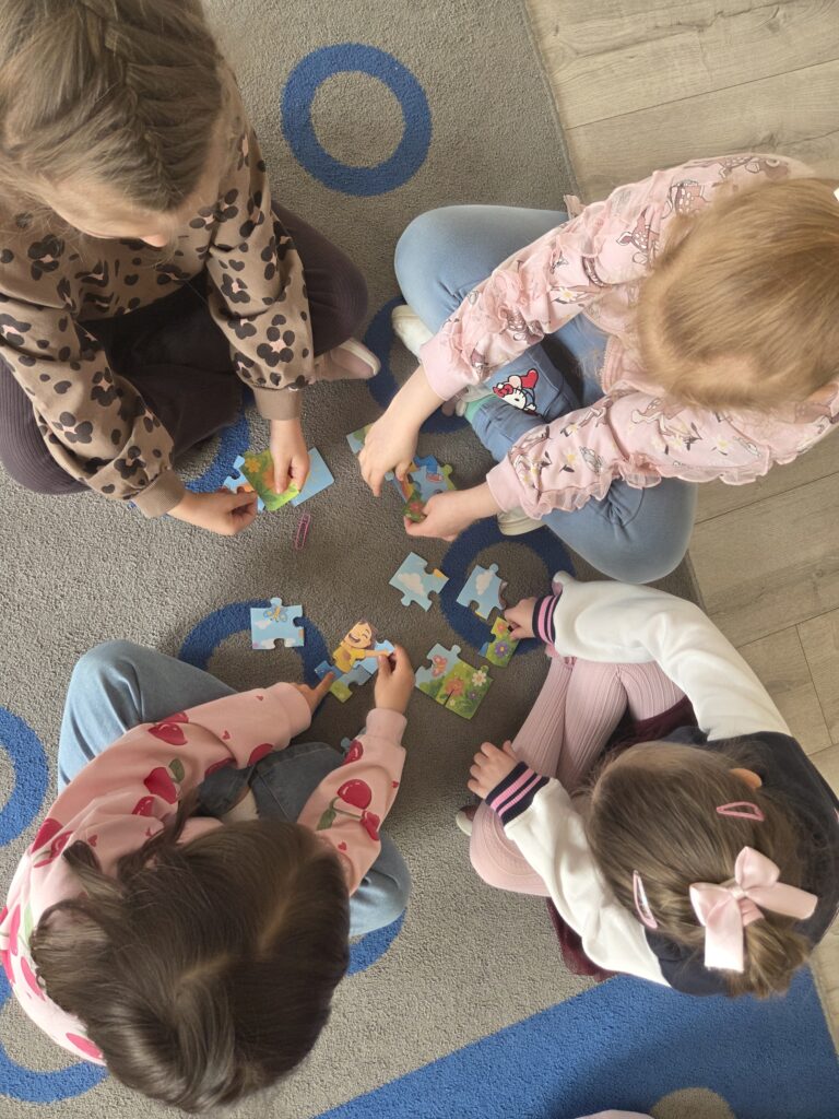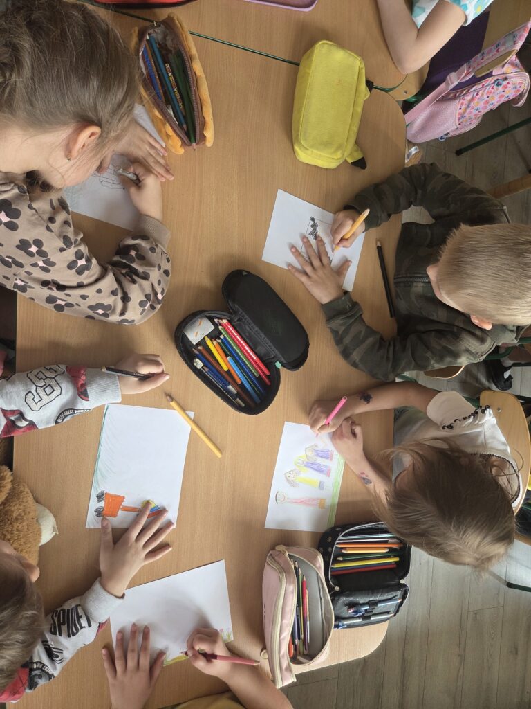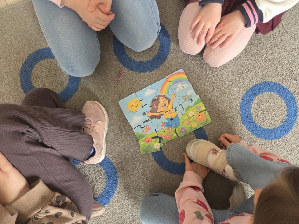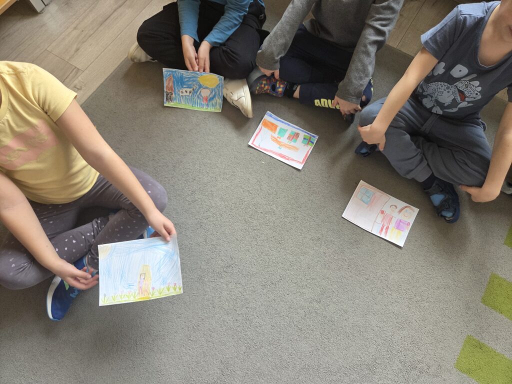 Kolejnym etapem było układanie puzzli obrazkowych i opowiadanie, co przedstawiają ilustracje. Ćwiczenie to rozwija spostrzegawczość oraz umiejętność wypowiadania się. W dalszej części zajęć przeprowadzono burzę mózgów – dzieci zastanawiały się, z czym kojarzy im się radość. Następnie rysowały swoją „własną radość” oraz sytuacje, które sprawiają im przyjemność, a z wykonanych prac powstał wspólny plakat.